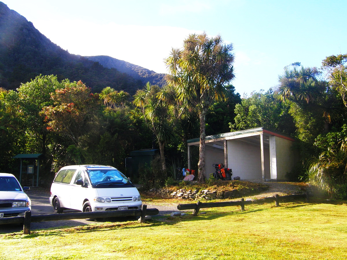 Bald darauf endet der Radweg und verläuft nun ausnahmslos auf dem hier überwiegend von Touristen stark frequentierten Highway 6. Außer ein paar kleinen abgehenden Stichstraßen, gibt es in dieser Region keine anderen Verkehrswege. Hier erwischt uns ein heftiger Regenschauer mitten auf einer Strecke, wo weit und breit kein Unterschlupf ist. In großer Hast erreichen wir dann endlich einen Rastplatz an der Straße, der sogar einen überdachten Sitzbereich hat. Patschnass schlüpfen wir unter und wenig später wird uns aus einem der parkenden Wohnmobile zwei Tassen mit heißem Tee gebracht werden. Bei so viel spürbarer Nächstenliebe schaut die Welt doch gleich wieder ein bisschen heller aus. Der Rastplatz ist zugleich ein DOC Übernachtungsplatz an einem Seeufer und so verbingen wir auch gleich die Nacht hier.