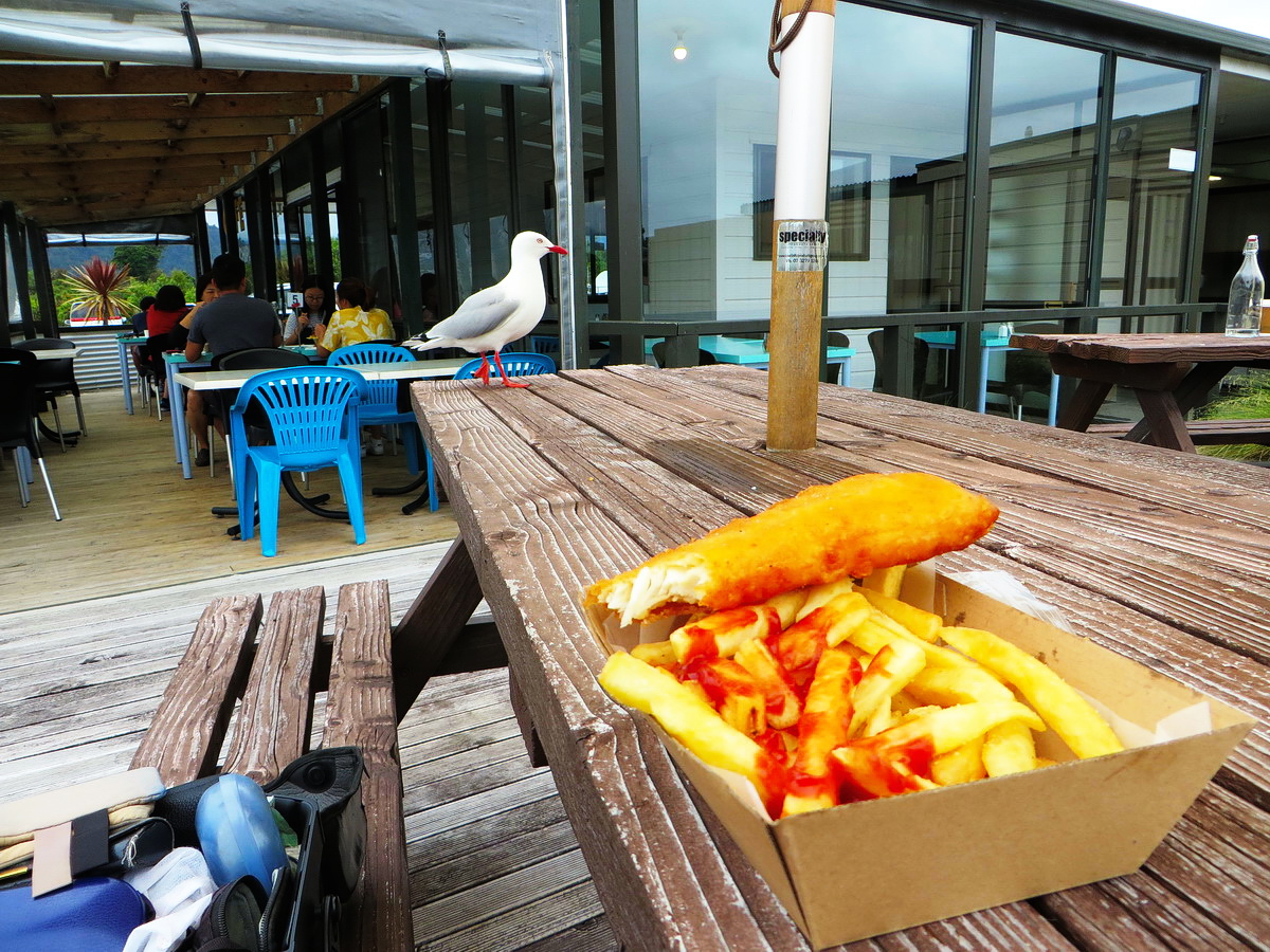 Im Ortszentrum von Haast tummeln sich viele Touristen. Es ist Mittagszeit und viele machen ebenso, wie wir, einen Stop und genehmigen sich eine Portion Fish und Chips. Noch ist die Küste nah und es gibt einige Möwen, die geduldig und sehr geschickt auf Rester warten.